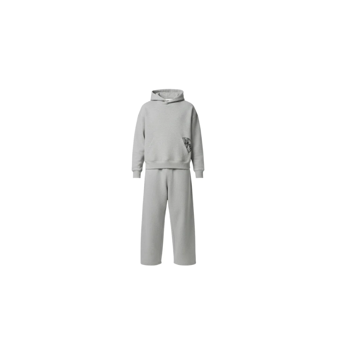 This heavyweight fleece tracksuit combines oversized comfort with bold street attitude. Featuring wide-leg sweatpants and a roomy hoodie, both pieces are finished with a graphic back-pocket patch for a standout look. Available in classic grey and black.
